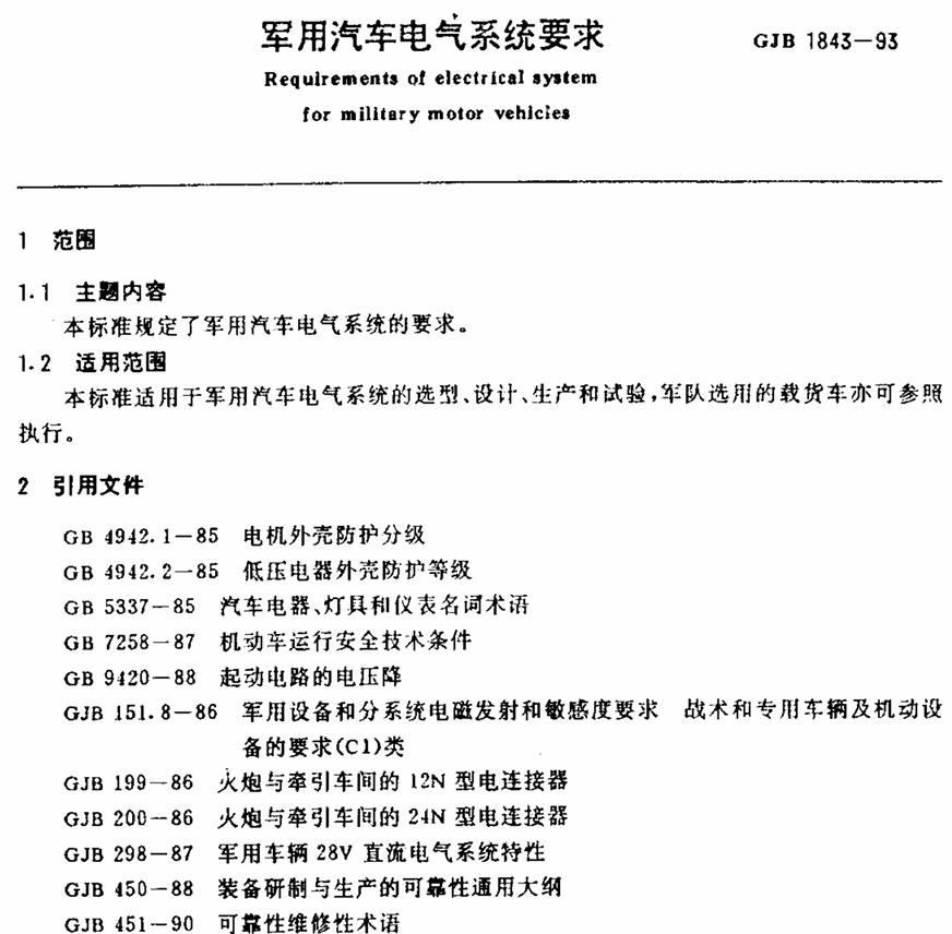 GJB 1843-1993 军用汽车电气系统要求PDF免费下载