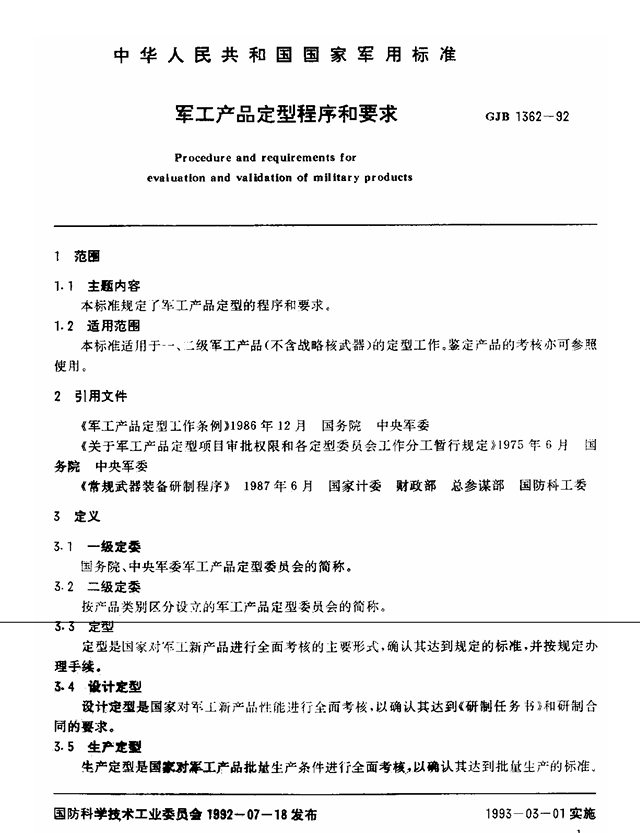 (关于军工产品定型项目审批权限和各定型委员会工作分工暂行规定》1975年6月国务院 中央军委《常规武器装备研制程序》1987年6月 国家计委 财政部 总参谋部 国防科工委